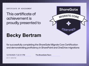 This experience not only reaffirmed ShareGate’s value as a robust migration solution, but also deepened our technical fluency across its toolset. We are excited to have Savvy’s President, Becky Bertram, ShareGate certified! Savvy is proud to continue to offer certified ShareGate services to our clients—backed by real-world experience and a commitment to seamless, secure migrations.