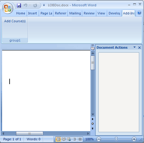 Click on the Add-Ins tab on you’ll see your new Ribbon. Click on the button, and the Document Actions task pane should show up. It’s empty as of yet, but it’s open! Try clicking on the ribbon link again to close it.