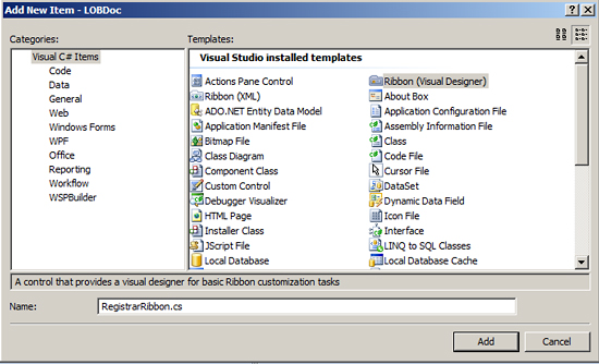 The first thing we need to do is add a custom Ribbon. You can do this by adding the “Ribbon (Visual Designer)” item to your project.
