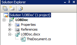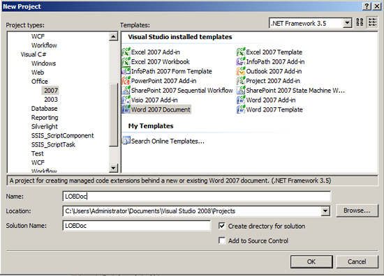 The first thing you’ll do is create a new Word 2007 Document project in Visual Studio. You should see the Word 2007 Project Template under “Office” and “2007”. This example will be created using C#. We’ll name our project LOBDoc.