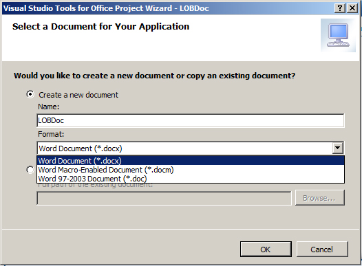 In the next screen, you’ll specify what type of document you’ll be creating, whether it’s a .docx, .docm, or .doc document. In this example, we’ll be creating a .docx document, so we can take advantage of the OpenXML features of Word 2007.