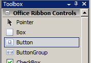 The first thing you’ll do is drag and drop the “Button” control from the Toolbox onto the ribbon. The control is in the “Office Ribbon Control” group of controls.