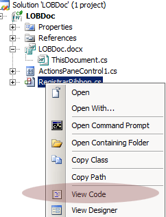Right click on the Ribbon control and select “View Code” to view the code-behind.