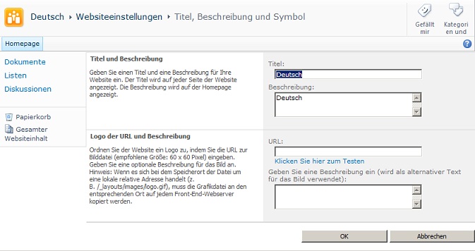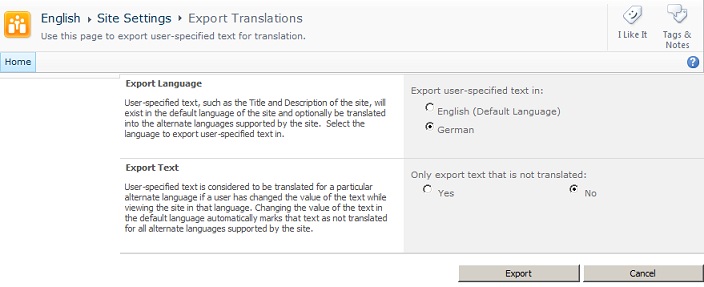 In addition, SharePoint will now automatically generate a Resource file (.resx) for your language based on the values users have modified simply using the browser, as in the example above. For example, by going to the “Export Translations” screen, I can export the names and descritpions of my site, lists, and libraries that were edited while I was viewing the site in German: