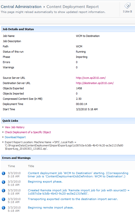 As you can see, the report will show you how many items have been exported, and how many items have been imported. In addition, the report will show you the name of the Timer Job that is being executed. (Clicking on the Timer Job status message will actually take you to the Timer Job itself, which is helpful if the job seems to have stalled for any reason.)
