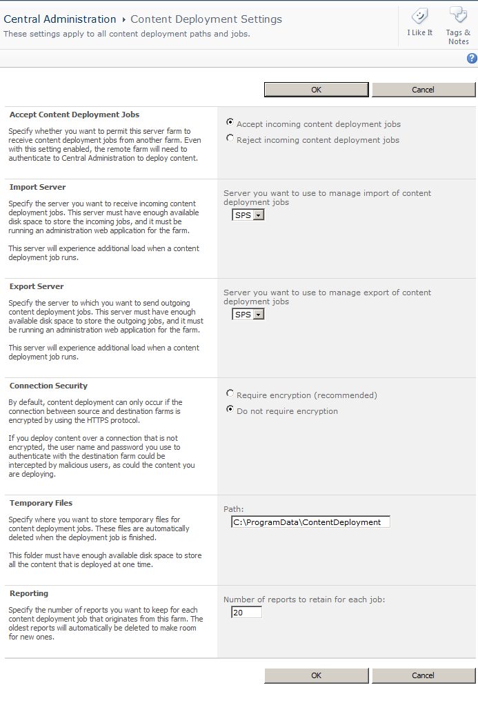 Return to the same page in your source destination farm, this time specifying which server in your farm will be responsible for exporting content deployment jobs. You’ll need to specify whether you want the user name, password, and deployment content passed to the destination server using a secure or insecure connection. You’ll also need to specify a location that is accessible by both servers, where the temporary files (such as the exported files) can be placed.