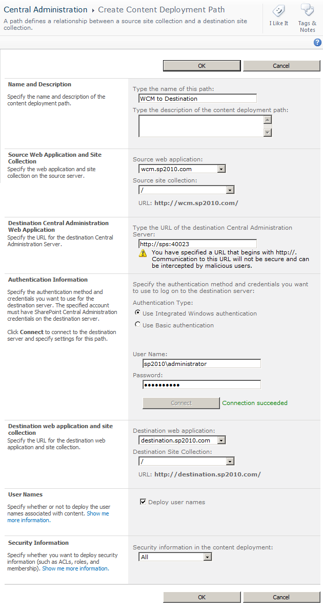 On this page you’ll need to give your content deployment path a page, and then specify which Site Collection you’re exporting. Next, you’ll need to specify the URL of the Central Administration site in the destination server farm. (Note that if you don’t use a secure connection, the credentials you pass to the destination server could be intercepted.) You’ll need to type in credentials that are valid on the destination server, which will be used on the destination server to import the data into the Site Collection there. Once you’ve typed in valid credentials, you’ll click the “Connect” button. If the credentials are successful, you’ll see a list of the available Web Applications in the destination server farm, and then you’ll be able to choose which Site Collection you would like to export to. Finally, you can specify which security objects you’d like to export, whether that’s individual users, or roles, ACL’s, etc.