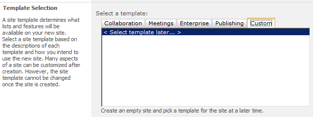 To do this, you’ll go to the “Create Site Collection” page for your destination Web Application, and click on the “Custom” tab when choosing your site template. Highlight the option that says “< Select template later… >”.