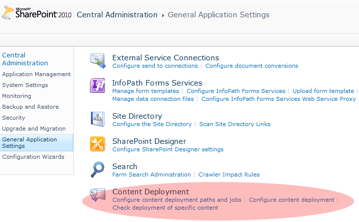 Your “home base” for managing your content deployment settings in your farm is the “General Application Settings” page in Central Administration. You should see a section at the bottom of the page with links to the Content Deployment settings.