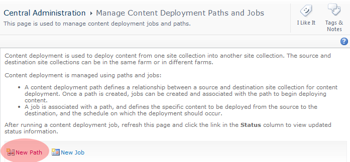 Now that you’ve set up both server farms and created your empty Site Collection, it’s time to set up your content deployment “path”. This is what tells SharePoint which Site Collection in the “source” farm maps to which Site Collection in the “destination” farm. To create a path, go to the General Application Settings page and click on the “Configure Content deployment paths and jobs” link.