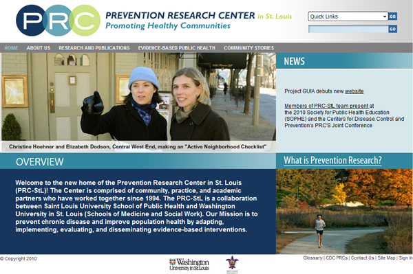 I’ve been working the last several months with the St. Louis Prevention Research Center, to help them rebuild their site using SharePoint 2007. They finally launched their re-designed site last week. The site uses only out of the box features of SharePoint, and all customizations were done with SharePoint Designer. (You could say the site is “code-free”.) Visit the site for yourself at http://prcstl.wustl.edu.