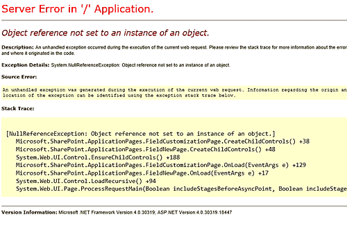 [NullReferenceException: Object reference not set to an instance of an object.] Microsoft.SharePoint.ApplicationPages.FieldCustomizationPage.CreateChildControls() +38