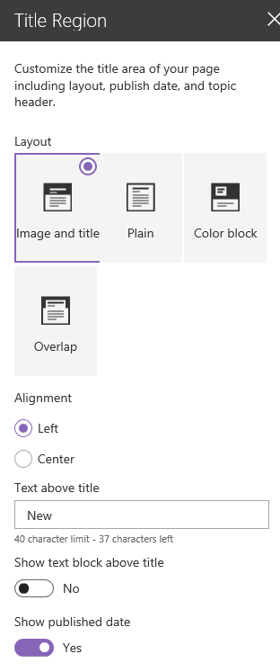 - You can add a text block above the title of the page. (This is similar to the functionality that has been a part of the “Hero” web part for quite some time in the main tile.) You simply type the text in (i.e. it’s a “single line of text” as opposed to selecting from a list of keywords somewhere.)