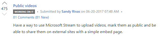 - Stream: If you go to http://aka.ms/streamideas you will see a list of ideas from the general public for ways to improve Stream. The most exciting thing I see on that list is that the Stream team is working on a way to embed Stream videos from your tenant on a public web site. This is huge in my opinion. Literally just today I had a conversation with a client who wants to be able to post webinar videos to folks outside the organization.